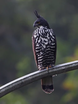 It is a fairly small eagle at about 51–58 cm in length. Adult has a thick white band on uppertail and undertail, all black above, black spotted breast, barred below. It has a prominent crest like the bazas. Juvenile is dark brown above, and has a light brown head and underparts.