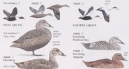 The Common eider (Somateria mollissima), is a is a large (50–71 cm body length) species of eider that is distributed over the northern coasts of Europe, North America and eastern Siberia. The word "eider" comes from Swedish eider which comes from Icelandic æður which is from Old Norse æðr. Further etymology uncertain. It is cognate with Proto-Samic *(h)āvtë which is a daughter language of Proto-Uralic, the proto-language of the Uralic language family, but no cognate has been found outside of the Samic languages. Most likely, the words both come from a common substrate source. It breeds in the Arctic and some northern temperate regions, but winters somewhat farther south in temperate zones, when it can form large flocks on coastal waters. It can fly at speeds up to 113 km/h (70 mph).