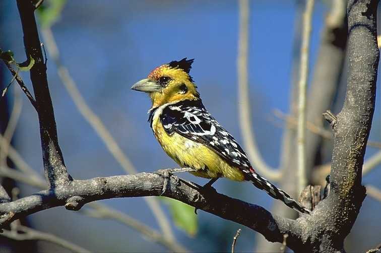 With its thick bill and very colorful plumage the crested barbet is unmistakable. This small bird has a speckled yellow and red face with a small black crest. The belly is yellow with red speckles, wings are black with white specks and it has a broad black band on its neck. Yellow head and body with black and white feathers, red markings on end of body, its colour blends well in the bush. They have a distinct shrill.