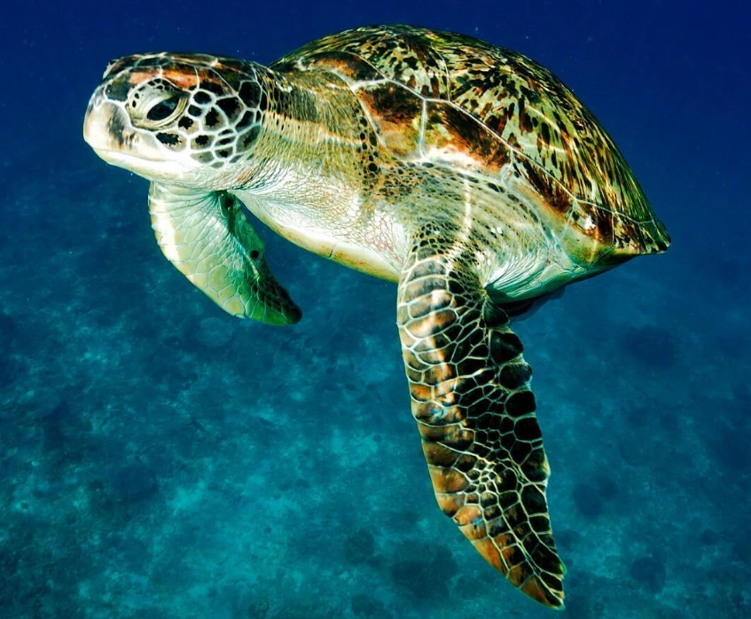The Green Sea Turtle (Chelonia mydas) is a species from the Cholonia genus. Its range extends throughout tropical and subtropical seas and oceans around the world, with two distinct populations in the Atlantic and Pacific Oceans.