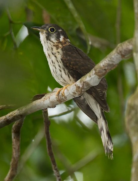 The moustached hawk-cuckoo is 25–30 cm (9.8–11.8 in) long, and it weighs about 58–63 g (2.0–2.2 oz). The crown and nape are grey. The ear coverts are white, and there is a blackish moustache. The back is brown, and the tail has brown bands and a buffy or white tip. The flight feathers have buffy bars. The underparts are creamy-white, with blackish streaks. The eye is dark brown or grey, with a yellow eye-ring around it. The beak is black, and the feet are orange-yellow. The juvenile bird's back and wings are blackish, and it has black streaks on its breast. The fledgling also has a moustache.
