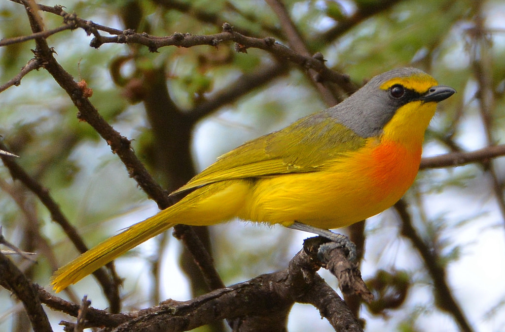 The Orange-breasted bushshrike or sulphur-breasted bushshrike (Telophorus sulfureopectus), is a species of bushshrike in the Malaconotidae family. It is found in Angola, Benin, Botswana, Burkina Faso, Burundi, Cameroon, Central African Republic, Chad, Democratic Republic of the Congo, Ivory Coast, Ethiopia, Gabon, Gambia, Ghana, Guinea, Guinea-Bissau, Kenya, Malawi, Mali, Mozambique, Namibia, Niger, Nigeria, Rwanda, Senegal, Sierra Leone, Somalia, South Africa, Sudan, Swaziland, Tanzania, Togo, Uganda, Zambia and Zimbabwe. Its natural habitats are subtropical or tropical dry forests, dry savanna and moist savanna. Another species, Braun's bushshrike, is sometimes called orange-breasted bushshrike, as well.