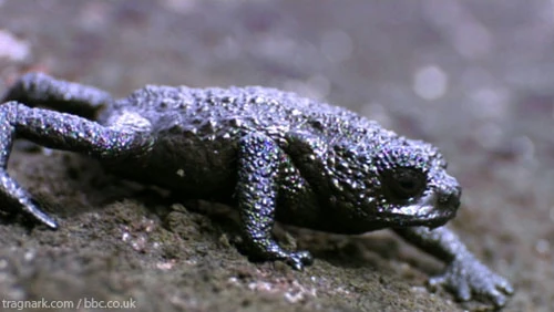 When threatened, the toad folds its limbs under its body, tucks its head in and tenses in a ball shape. If on an incline, this causes it to roll down the slope, escaping the attention of its predator, and looking like a tumbling pebble. Its cryptic black and dark grey coloring that may appear as dark navy blue to some blends with its sandstone habitat. This toad was featured on the BBC series, Life, pursued by a tarantula. It is a very small specie of toad; about an inch in length.