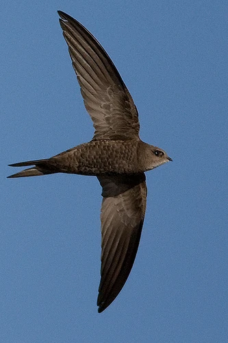 It is entirely dark except for a large white throat patch which is frequently visible from a distance. It is chunkier and browner than common swift, and the slightly paler flight feathers, underparts and rump give more contrast than that species. It also has a scalier looking belly and subtly different flight action. The call is a loud dry scream similar to that of its relative, though possibly more disyllabic.