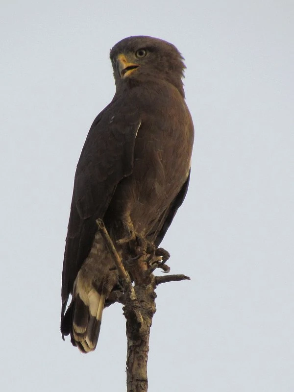 The Western banded snake eagle (Circaetus cinerascens), is a species of grey-brown bird of prey with a short tail and a large head. Juveniles have paler and browner upper parts than adults, with white-edged feathers. Head, neck and breast are dark-streaked. The underparts are white with pale brown streaks, mainly on belly and thighs. Subadults may be all dark grey-brown without any streak on underparts. The eyes, ears, and legs are yellow. They have crested chests.